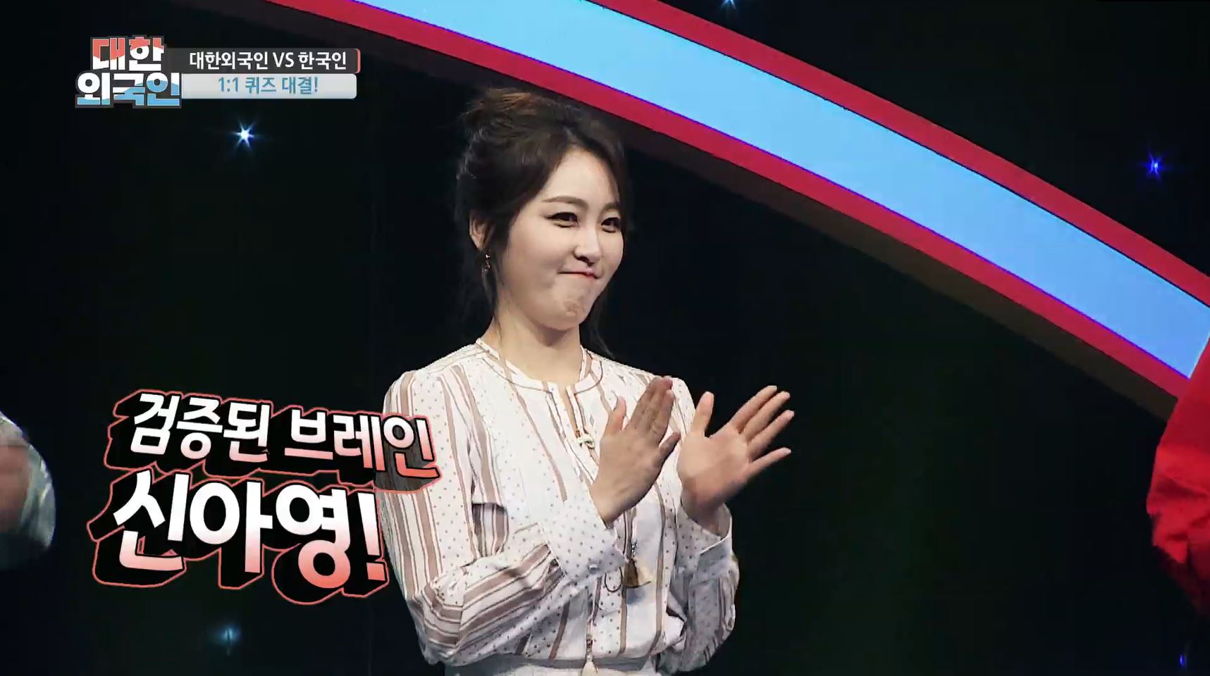 신아영은 하버드대 역사학과 출신으로 세계 5대 은행인 ‘스코틀랜드 왕립은행’과 외교부 인턴 경력, 4개 국어 가능한 언어 천재 등 역대 급 화려한 스펙을 자랑하며 강력한 우승 후보로 떠올랐다. 하지만 그녀는 “퀴즈는 학문이 아니라 순발력과 센스다. 오늘의 에이스는 딘딘”이라며 의외의 발언을 해 모두를 놀라게 했다. 이에 딘딘은 다양한 프로그램을 통해 쌓은 지식과 발군의 순발력으로 퀴즈에 대한 자신감을 내비쳤다. “1층은 7분이면 통과할 수 있다. 못해도 7단계까지는 갈 것”이라며 대한외국인 팀을 도발했다.