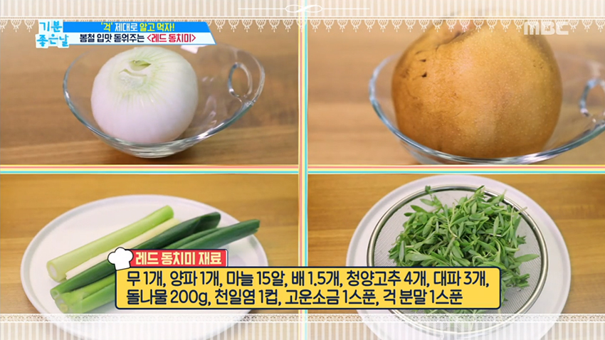 * 재료: 무 1개, 양파 1개, 마늘 15알, 배 1.5개, 청양고추 4개, 대파 3개, 돌나물 200g, 천일염 1컵, 고운 소금 1스푼, 걱 분말 1스푼