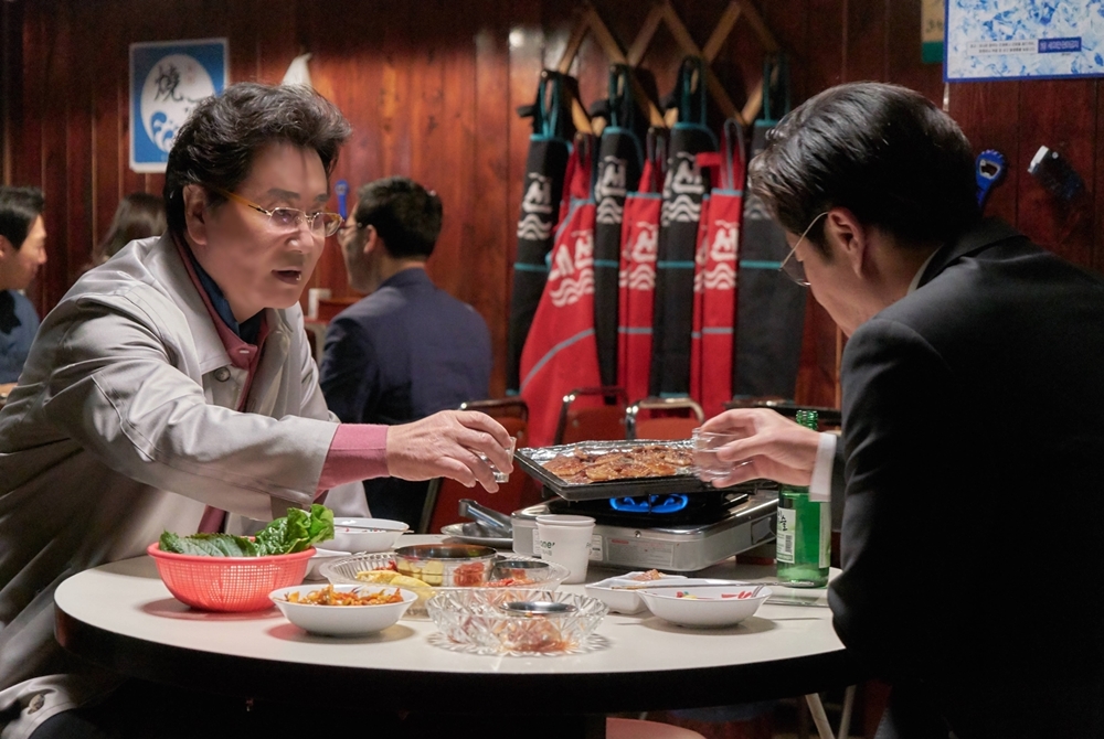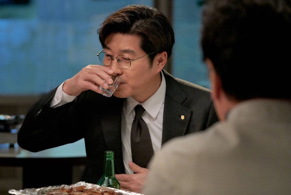 사진 속 슈트를 차려 입은 대호와 캐주얼한 차림의 강행장이 대비를 이루며 이들의 눈빛 또한 극과 극의 분위기를 자아내고 있다. 소주를 마시는 대호에게 시선을 고정한 강행장의 모습은 어딘가 서늘한 느낌마저 전해주며 보는 이들을 긴장하게 만든다.