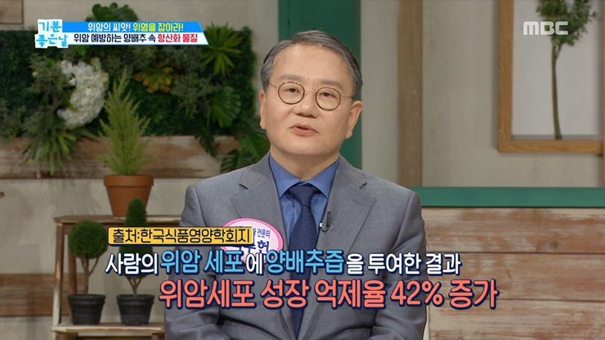 2. 사람의 위암 세포에 양배추즙을 투여한 결과 위암 세포 성장 억제율 42%가 증가하였다.