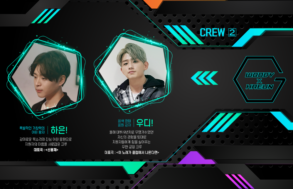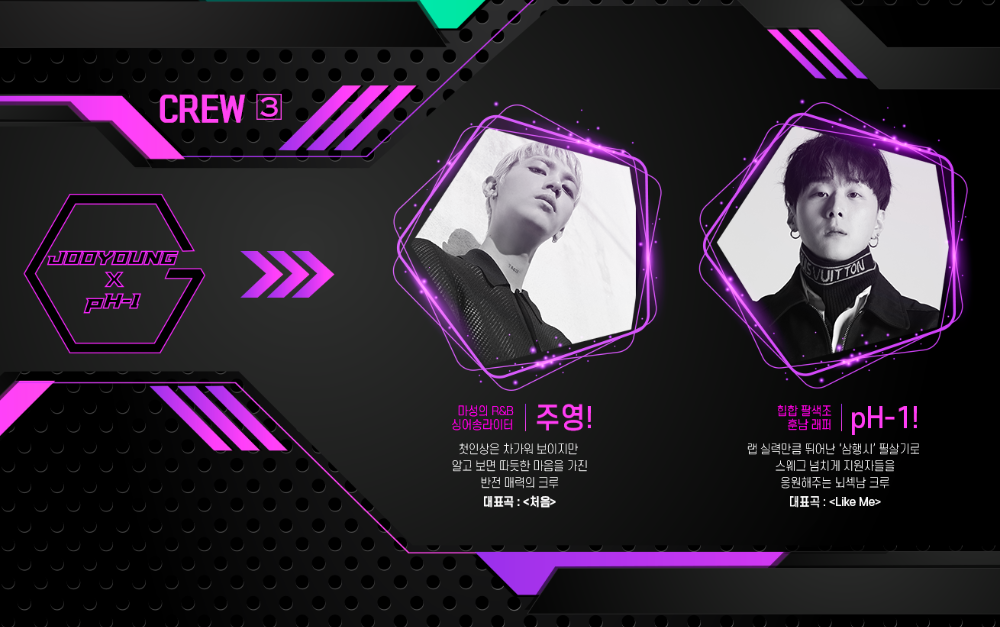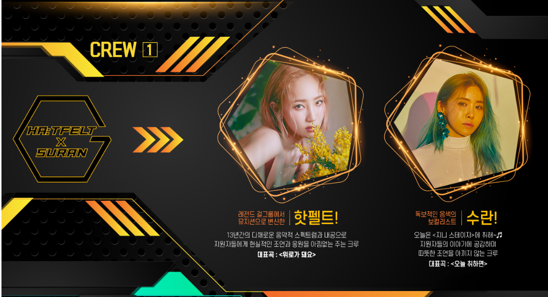 첫 방송에 앞서 ‘지니 스테이지’는 프로그램의 중심이 될 응원 크루 6인을 공개했다. 레전드 걸그룹에서 아티스트로 완벽 변신한 핫펠트, 독보적인 음색의 보컬리스트 수란. 그리고 감각적인 음악을 선보이는 주영, 대한민국의 가장 힙한 래퍼 pH-1. 마지막으로 새로운 음원강자 우디와 차세대 보컬리스트로 떠오르고 있는 하은이 그 주인공이다.