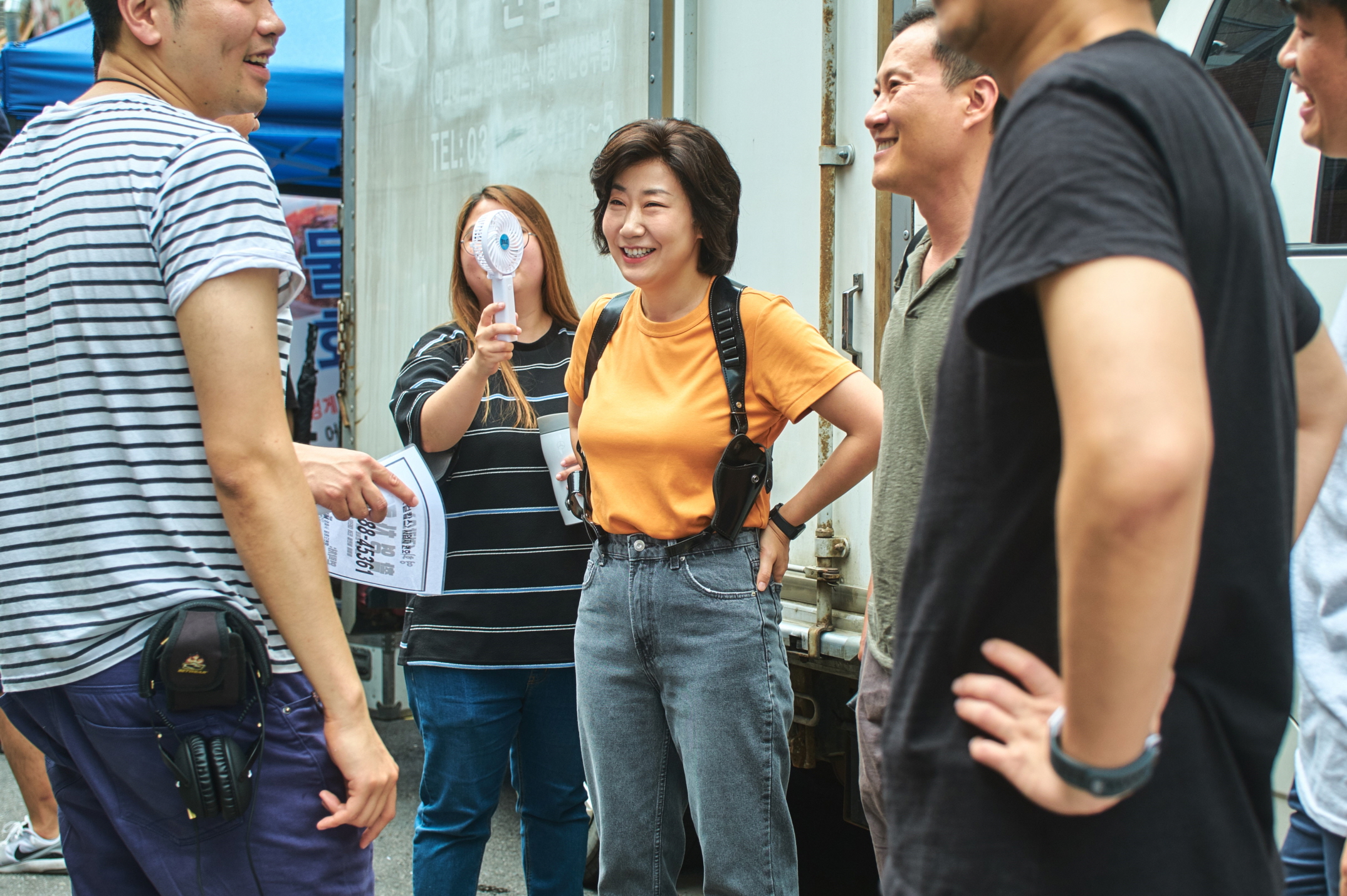 또한 총 5회 차 진행된 옥상 씬은 그늘 한 점 없는 뙤약볕 아래에서 촬영이 진행되어 그 열기가 더욱 후끈했다. 특히 라미란, 이성경, 윤상현이 함께한 화재 장면은 불로 더위를 이겨낸 그야말로 ‘이열치열’의 현장이었다는 후문. 과거 회상 씬을 위해 가죽 점퍼와 가발까지 착용하고 옥상으로 질주해야 했던 라미란은 “정신줄을 잡기 위해 노력했다. ‘걸캅스’는 정말 뜨거웠던 것이 가장 기억에 남는다”며 남달랐던 현장에 대한 소감을 전했다.