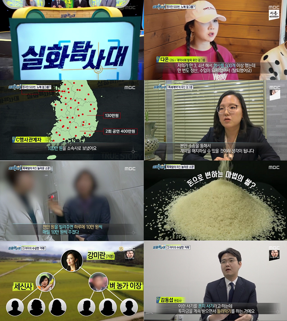 4년 동안 500번이 넘는 행사를 했는데도 정산도 못 받고, 대표의 폭언까지 들어야했던 걸그룹 멤버들. 그의 언행에 MC 신동엽은 “아직도 저런 소속사가 존재하느냐”며 경악을 금치 못했다. 또 다른 피해자가 생기는 것을 막기 위해 방송 출연을 결심했다는 멤버들. ‘실화탐사대’는 불공정한 계약서에 묶여 아무것도 못하는 멤버들에 대해 안타까움을 표시하는 한편, 조금 불편하더라도 전속 계약서를 작성할 때는 변호사의 자문을 꼭 구해야 하는 것이 좋다고 조언했다.