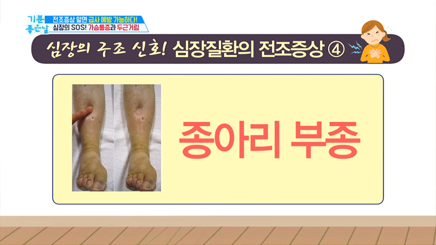 6. 종아리에 부종이 생기는 경우도 혈액의 선순환이 이루어지지 않아 발생기므로 심장질환을 조심해야 한다.