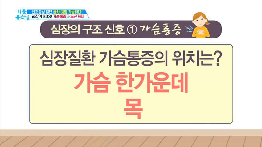 1. 심장질환의 가슴 통증의 위치는 가슴 한가운데 목, 딱딱하게 만져지는 곳이다.