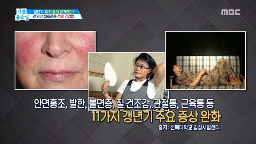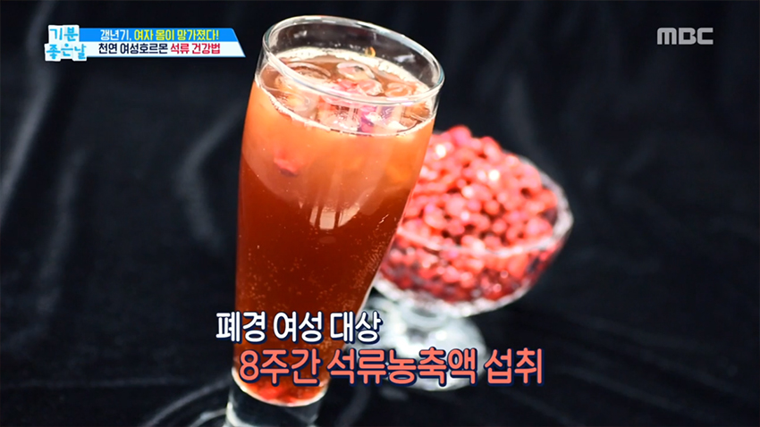 6. 폐경 여성을 대상으로 8주간 석류 농축액을 섭취한 실험 결과 안면홍조, 발한, 불면증, 질 건조함, 관절통, 근육통 등 11가지 갱년기 주요 증상들이 완화되었다.