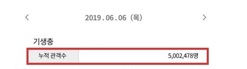 영화 ‘기생충’은 전원백수인 ‘기택’네 장남 ‘기우’가 고액 과외 면접을 위해 ‘박사장’네 집에 발을 들이면서 시작된 두 가족의 만남이 걷잡을 수 없는 사건으로 번져가는 이야기를 그렸다. 영화진흥위원회 통합전산망에 따르면 ‘기생충’은 개봉 8일 째인 6월 6일(목) 오후 12시 47분 누적 관객수 500만 명을 돌파했다.