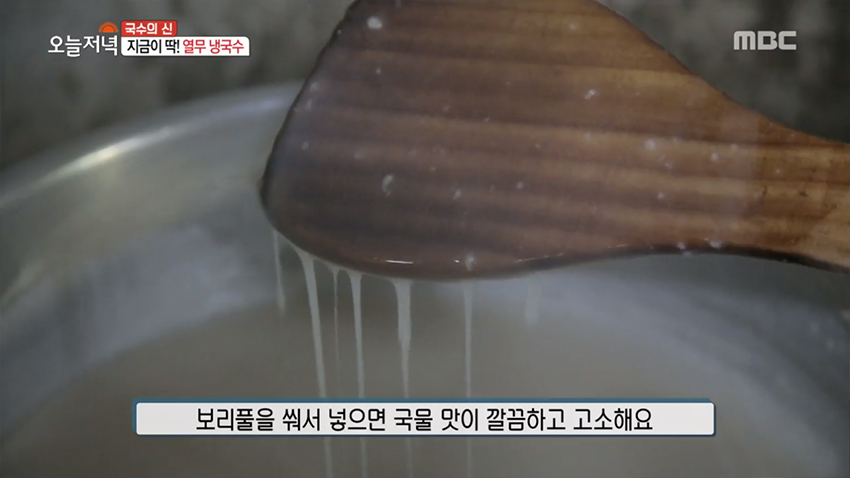 3. 예전 방식대로 밀가루나 찹쌀로 풀을 쒀서 사용하면 끈적끈적한 국물이 되기 때문에 보리풀을 쒀서 깔끔하고 고소한 맛을 높여준다.
