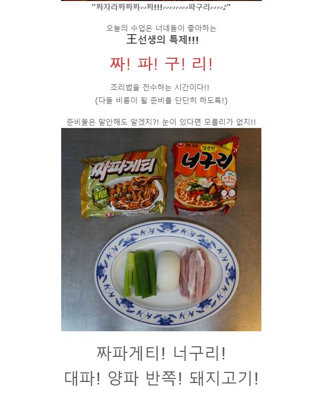 ‘기생충’을 보고 극장을 나서는 관객이라면 누구나 머리 속에 ‘짜파구리가 먹고 싶다’고 떠올릴 정도로 인상적인 비주얼을 뽐낸 ‘충숙’(장혜진)의 짜파구리. 다급한 상황 속에서도 오직 짜파구리를 만들어야 한다는 사명으로 요리에 임하는 ‘충숙’의 모습은 관객들에게 긴장과 함께 웃음을 선사한다. 극장 상영 버전에서는 삭제되었으나 촬영 당시 ‘충숙’이 짜파구리 레시피를 찾아보는 장면이 있어, 제작진은 블로그를 개설해 실제 짜파구리 레시피를 올려놓았다. 비록 ‘충숙’의 짜파구리처럼 한우를 사용한 것은 아니지만 ‘기생충’을 관람하고 난 관객들의 짜파구리에 대한 갈망을 해결해줄 레시피를 확인할 수 있다. (//blog.daum.net/o_dok/2)