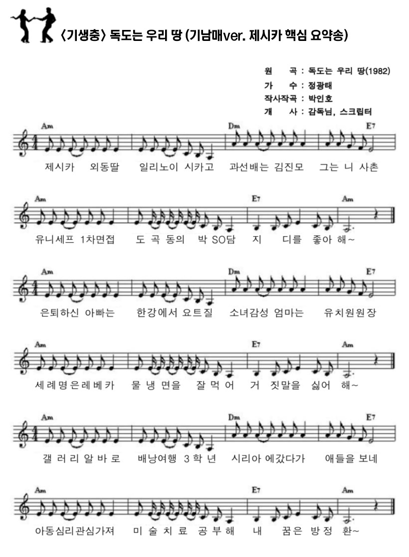 ‘박사장’네 영어 과외 선생님으로 취업에 성공한 ‘기우’는 동생 ‘기정’(박소담)을 ‘다송’의 미술 과외 선생님으로 소개하고자 함께 ‘박사장’네로 향한다. 초인종을 누르기 직전 ‘기정’은 비장한 표정을 짓고 손가락으로 리듬을 타며 한국인이라면 누구나 익숙한 ‘독도는 우리 땅’ 리듬에 맞춰 “제시카 외동딸 일리노이 시카고 과 선배는 김진모 그는 니 사촌”이라며 ‘기우’와 입을 맞춘 내용을 가사로 만들어 읊어댄다. 높은 중독성을 가진 ‘기정’의 노래는 예고편이 공개됐을 때부터 화제를 모았다. 1982년 발표된 ‘독도는 우리 땅’ 음을 따라 ‘제시카’ 캐릭터를 핵심 요약한 노래 가사는 봉준호 감독과 ‘기생충’의 공동 작가이자 스크립터를 맡았던 한진원 씨가 함께 개사했다. ‘도곡동의 박SO담’, ‘아동 심리 관심 가져 미술치료 공부해 내 꿈은 방정환’ 등 재치 넘치는 가사는 흥미를 자아내며 보는 이로 하여금 저절로 노래를 흥얼거리게 만든다.