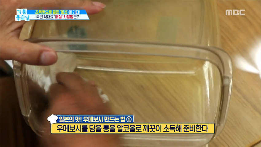 3. 우메보시를 담을 통을 알코올로 깨끗이 소독해 준비한다.