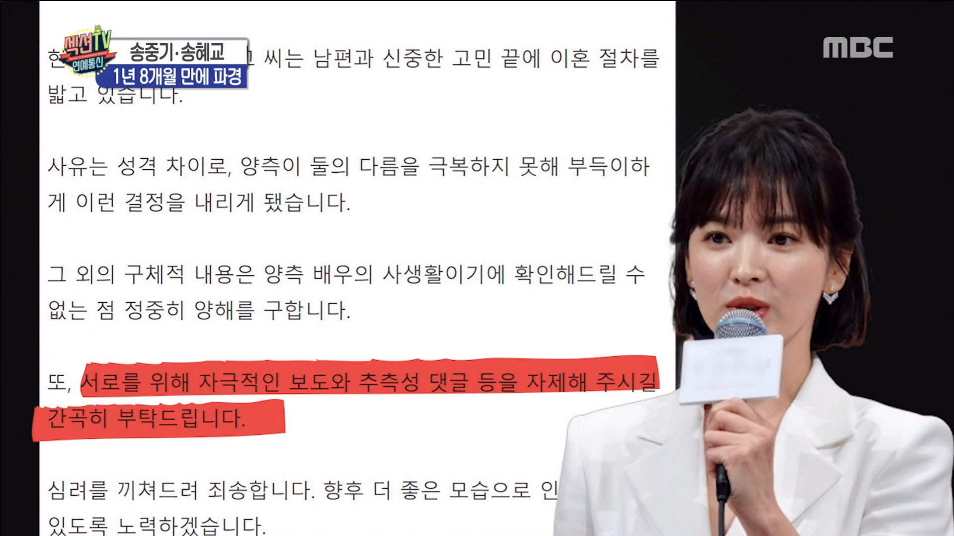 또한 송혜교 측은 ‘서로를 위해 자극적인 보도와 추측성 댓글 등을 자제해 주시길 간곡히 부탁드립니다’라고 전하기도 했다. 두 사람의 관계가 틀어졌다는 소문과 함께 신혼집에 우편물이 쌓인다거나 쓰레기를 배출하지 않는 등 두 사람이 신혼집에 거주하지 않는다는 추측이 나왔었다. 두 사람은 현재 이혼조정상태로 양측 모두 이혼은 결정한 상태이다.
