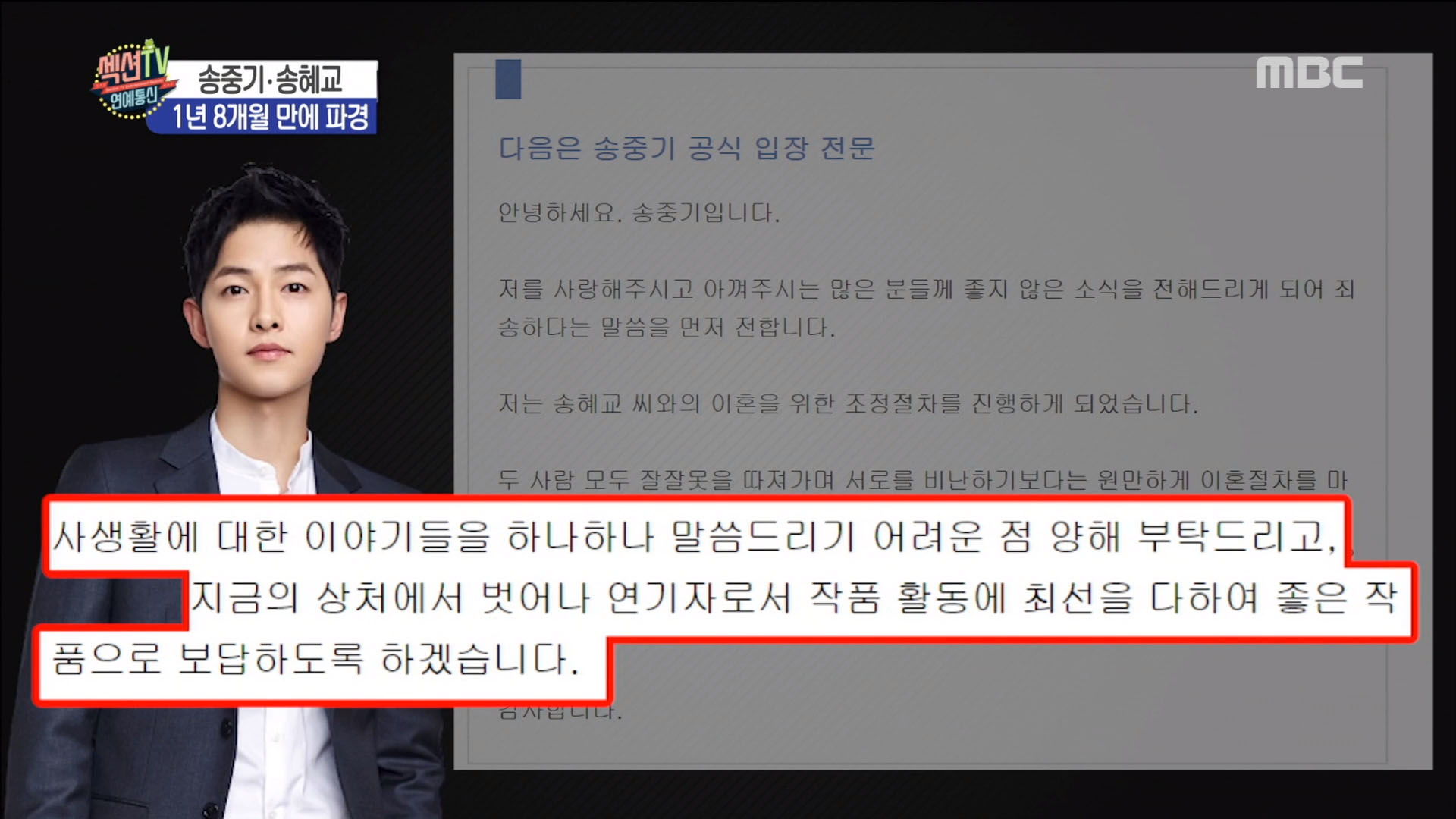 ‘사생활에 대한 이야기들을 하나하나 말씀드리기 어려운 점 양해 부탁드리고, 지금의 상처에서 벗어나 연기자로서 좋은 작품으로 보답하도록 하겠습니다’라고 공식 입장을 전했다. 이어서 송혜교 측도 ‘사유는 성격 차이로 양측이 다름을 극복하지 못해 부득이하게 이런 결정을 내리게 됐습니다’라고 전하며 이혼 사실을 공식적으로 인정했다.