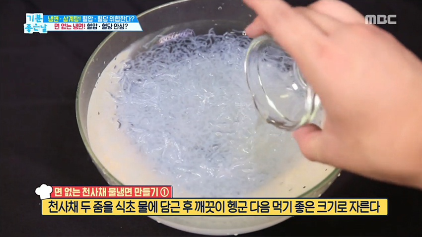 3. 시판용 냉면 육수를 붓으면 탄수화물을 확 줄인 천사채 냉면이 완성!