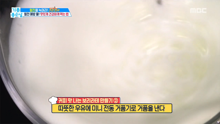 - 따뜻한 우유에 미니 전동 거품기로 거품을 낸다.