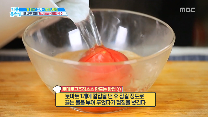 1. 토마토 1개에 칼집을 낸 후 잠길 정도로 끓는 물을 부어 두었다가 껍질을 벗긴다.