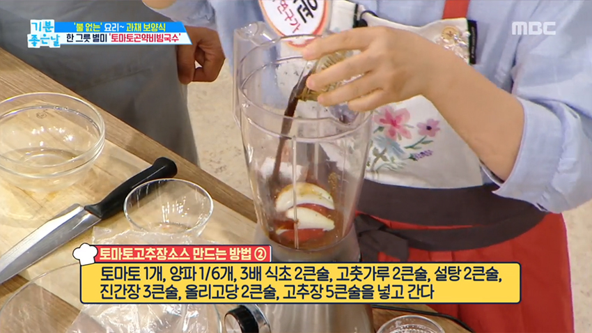 2. 토마토 1개, 양파 1/6개, 3배 식초 2 큰 술, 고춧가루 2 큰 술, 설탕 2 큰 술, 진간장 3 큰 술, 올리고당 2 큰 술, 고추장 5 큰 술을 넣고 간다.