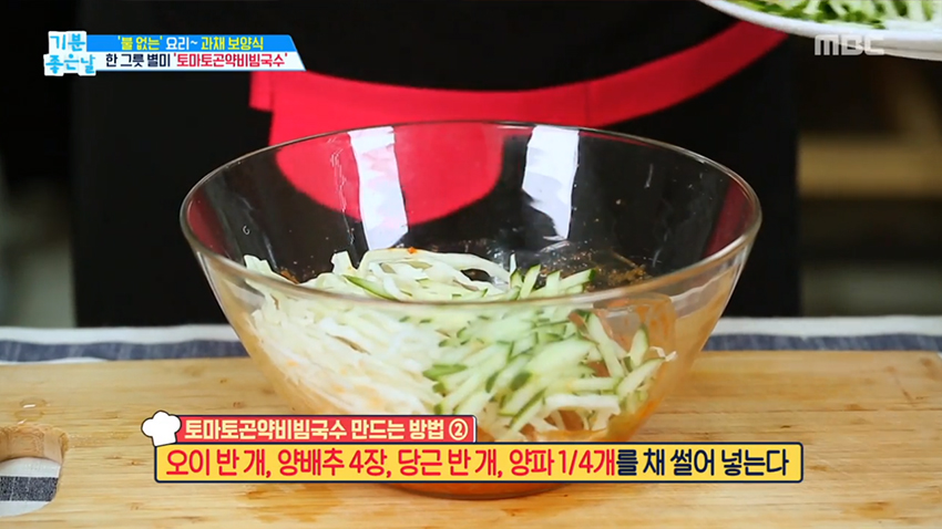 4. 오이 반 개, 양배추 4장, 당근 반 개, 양파 1/4개를 채 썰어 넣는다.