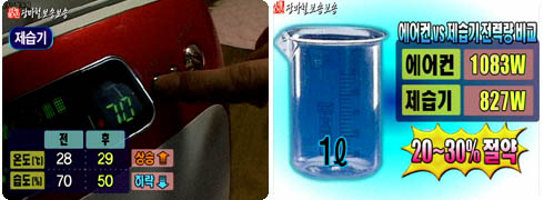 1L를 제습할 때 드는 소비전력은 에어컨이 1,083W, 제습기가 827W 소모된다.