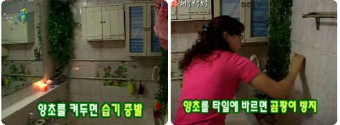 불을 켜 두면 습기를 없앨 수 있고, 쓰고 남은 조각 초를 타일 사이에 바르면