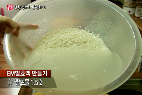 쌀 씻을 때 버려지는 쌀뜨물과 EM 원액, 당밀을 소주잔 1잔 정도씩 넣고 실온에서 7일~10일 정도 발효시키면 완성!