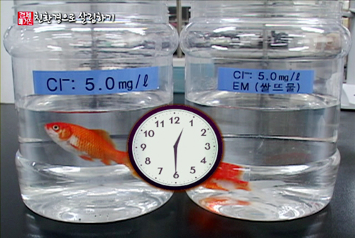 실제로 두 개의 어항에 리터당 5mg으로 농도를 맞춘 염소를 넣고 한쪽 어항에만 EM을 넣고 30분이 지나자,