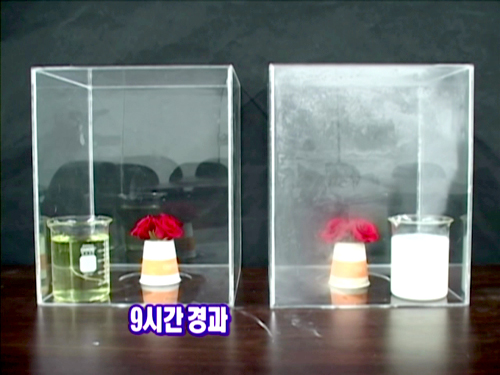 9시간이 지나자 산성 세제를 섞은 락스통의 꽃잎 색이 달라졌다.