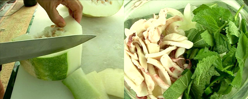 씨를 제거한 동과를 먹기 좋은 크기로 썰어준 뒤 데친 오징어와 야채를 넣어 고추장에 무쳐주면