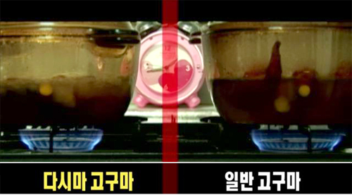같은 양의 고구마를 넣고 삶았을 때, 왼쪽 다시마를 넣은 냄비는 빨리 팔팔