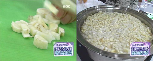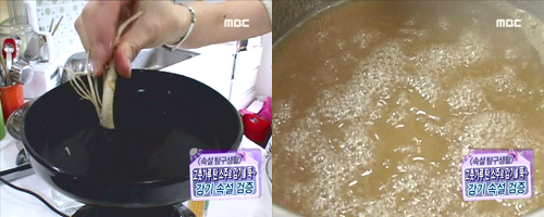 먼저 씨만 제거한 배와 도라지를 곱게 갈아준 다음 그 즙을 냄비에 붓고 팔팔 끓여준다.