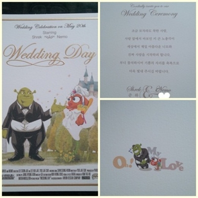 이와 더불어 뒷쪽 역시 이들의 캐릭터가 그려져 있어 여느 청첩장과는 다른 유쾌한 느낌을 준다. 사진을 접한 누리꾼들은 "정말 축하해요" "니모와 슈렉, 아름다운 동화 만들어가길 바랍니다" "<무한도전> 멤버들이 더 좋아할 듯" "청첩장이 부럽긴 처음" 등 축하의 반응을 보였다.