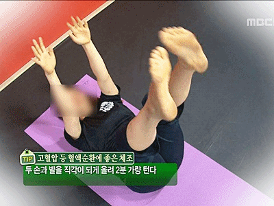혈액순환 체조 2. 두 손과 발을 직각이 되게 올려 2분 가량 턴다