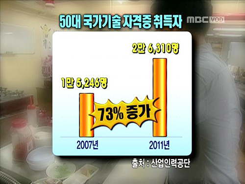 특히 50대의 경우 2011년 국가기술자격증 취득자가 2만 6천여 명으로 2007년에 비해 73%가 증가했다. 자격증을 준비하는 시간 동안 새로운 분야에 대해 경험을 쌓고, 다른 사람들과 몰랐던 정보를 주고받는 등 교류의 장을 경험할 수 있어 좋다.