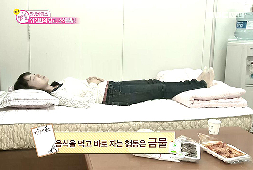 야식을 먹고 잘 경우, 위 속에 독소와 음식물이 남기 때문에 잠자는 동안은 위가 쉴 수 있도록 해주는 것이 좋다.