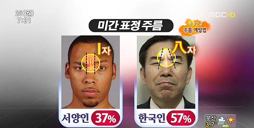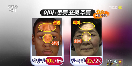 또 이마와 콧등에 생기는 수평 주름이 분명한 서양인에 비해, 우리나라 사람들은 상대적으로 희미한 편이다.