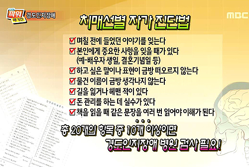 경도인지장애를 자가 진단할 수 있는 20개의 문항 중 10개 이상의 문항에 해당된다면 병원 검사가 필요하다.