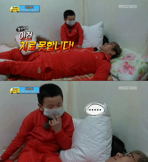 윤민수 부자는 귀여움이 한껏 뭍어나는 커플 트레이닝복을 입고 숙소에서 함께 병원놀이를 하는 가운데, 윤민수가 "허리가 아프다"고 통증을 호소하자 윤후는 "허리가 부러진 것 같다. 혹시 자기 아들을 업으신 적이 있냐?"며 윤민수에게 되물어 윤민수를 폭소케 했다.