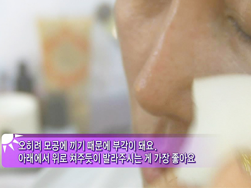 모공이 넓을 경우에는 수분감이 있는 파운데이션을 바르되 아래에서 위로 쳐주듯이