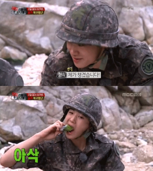 이날 고된 유격 훈련을 강행하게 된 연예인 병사들은 행군 도중 수분 섭취를 위한 간식으로 오이와 팥빙수를 배급받았다.