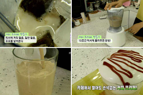 또 믹서에 커피얼음과 우유얼음을 넣어준 후 갈고 각자 취향에 맞게 토핑을 올려주면