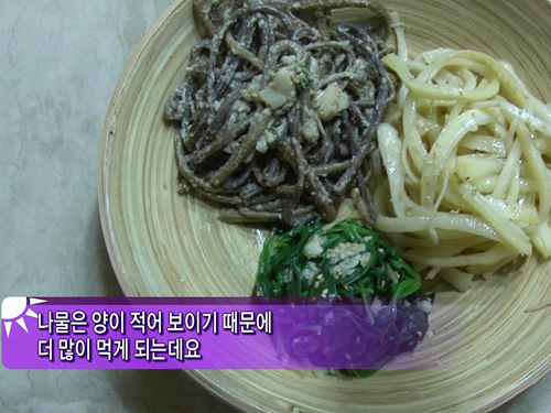 삼색 나물은 1인분에 397kcal로 채소 자체의 칼로리는 높지 않지만 대부분 기름에 볶은 후