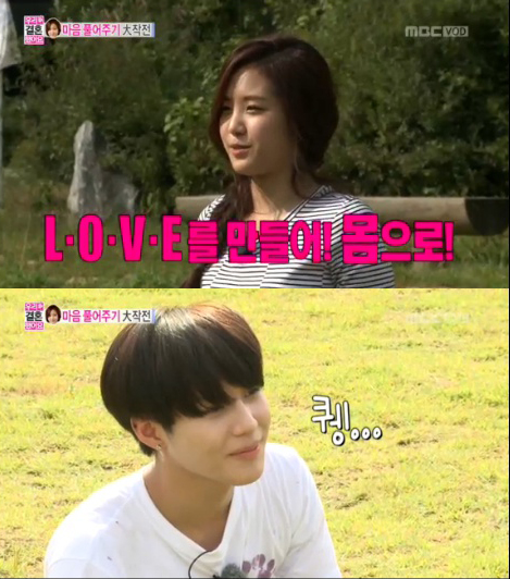 L.O.V.E 포즈로 사진을 찍자는 나은의 말에 태민은 폴짝 폴짝 뛰며 알파벳을 만들어갔고, 그의 노력에 마음이 풀린 나은은 함박 웃음을 지었다.