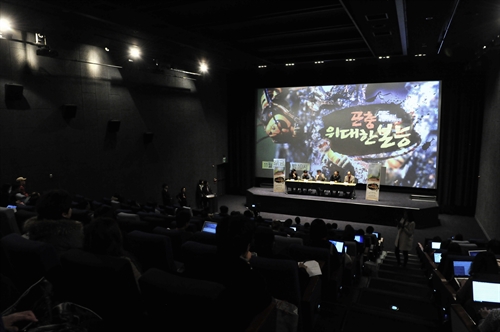 26일(화) 오후 2시 서울시 여의도에 위치한 CGV에서 MBC 창사 52주년 특별 다큐멘터리 <곤충, 위대한 본능>(이하 <곤충>)의 기자 간담회가 열렸다. 이날 기자 간담회에는 연출 김진만, 김정민 PD를 비롯해 손인식 촬영감독, 곤충 전문가 성기수, 곤충 사진 전문가 표도연 등 제작진이 참석해 자리를 빛냈다.