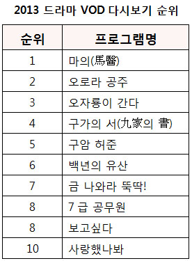 올 한해 MBC 드라마를 빛낸 작품들은 iMBC 다시보기 서비스에 대한 높은 관심을 통해서도 증명된다. 위의 네 작품을 포함하여 <마의>, <구암 허준>, <금나와라 뚝딱!>, <7급 공무원>, <보고싶다>, <사랑했나봐> 총 10작품이 순위권의 영광을 차지했다.