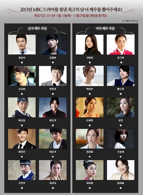 '2013 MBC 연기대상' 베스트 커플상과 남녀 인기상 투표는 12월 12일(목) 시작되어 12월 30일(월) 연기대상 시상식 생방송 중 투표가 마감된다.
