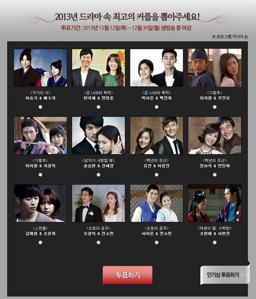 저물어 가는 2013년, 연말 시상식을 앞두고 시청자가 직접 뽑는 'MBC 연기대상 베스트 커플상' 투표가 시작됐다. 후보에는 <구가의 서>에서 인간과 신수의 가슴 아픈 사랑을 보여줬던 이승기와 배수지를 비롯해, <금 나와라 뚝딱!>의 한지혜, 연정훈, <기황후>에서 가슴 절절한 사랑을 보여주고 있는 하지원이 주진모, 지창욱과 함께 후보에 올랐다.