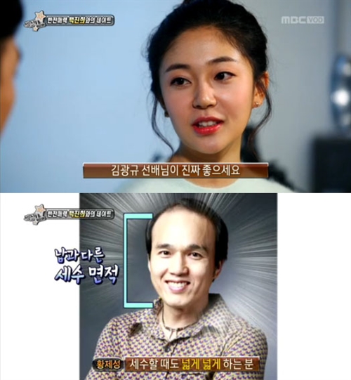 하지만 황제성은 백진희의 대답에 수긍하지 않는 듯 "피부 넓게 좋으시다"며 김광규의 적은 머리숱을 암시하는 장난기 어린 발언을 해 백진희를 폭소케 했다.