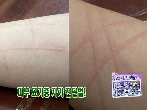 피부 묘기증의 자가 진단법으로 팔 한쪽 피부에 우물 정자 모양으로 그어서 2~3분 이상 기다려