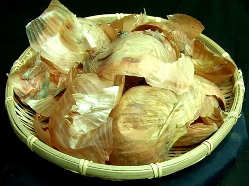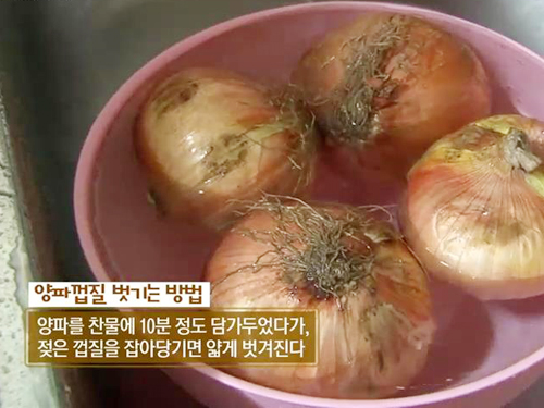 양파를 찬물에 10분 정도 담가두었다가 젖은 껍질을 잡아당겨 얇게 벗기고 건조시킨다.
