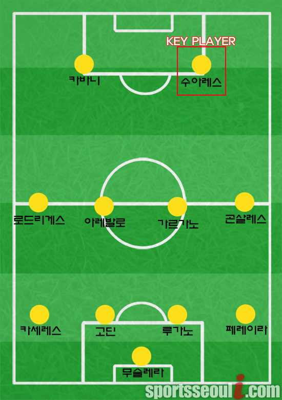 하지만 여전히 우루과이가 강팀이라는 데에는 이견이 없다. 오스카 타바레스(67) 감독이 구축한 4-4-2 포메이션은 조직력을 강조한다. 상대의 볼을 빼앗아 투톱인 루이스 수아레스(27·리버풀)과 에딘손 카바니(26·파리 생제르맹)를 향해 빠르게 패스를 보내 득점을 노리는 단순한 축구지만 파괴력 넘친다. 수비엔 경험이 풍부한 주장 디에고 루가노(33·무적)과 올 시즌 소속팀 아틀레티코 마드리드를 프리메라리가 우승으로 이끈 디에고 고딘(28)이 버티고 있다.